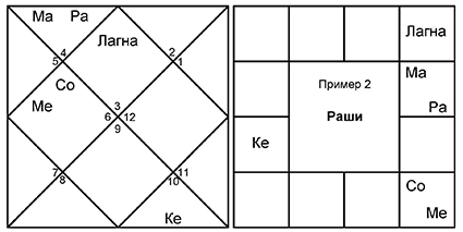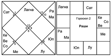 Посмотрим на гороскоп 2 в следующем примере. У этого человека в доме произошла крупная кража в основной период Меркурия, подпериод Солнца и подподпериод Марса, были украдены украшения его жены общей стоимостью в 40 000 рупий. Такое происшествие можно объяснить только астрологическими принципами. Владелец гороскопа периодически сталкивался с утратой и кражей имущества.