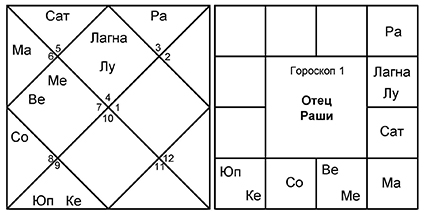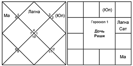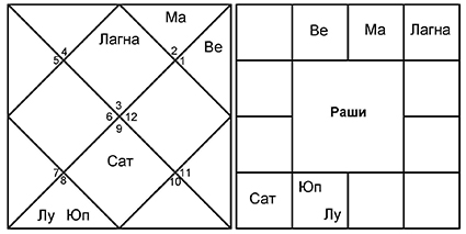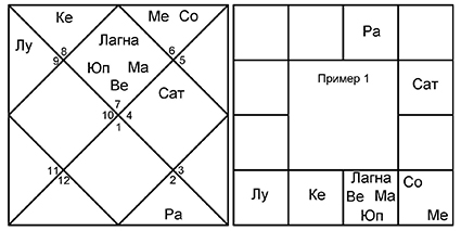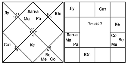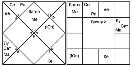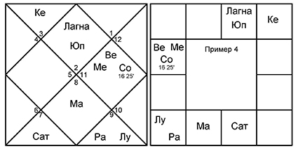 Не забываем, что в 7-м доме и от Лагны, и от Луны оказываются злые планеты Сатурн и Марс. Эти малефики управляют 8-м и 6-м домами, соответственно. Управители 7-го дома в обоих случаях благоприятные – Юпитер и Венера, которые попадают в 6-й дом споров и тяжб.