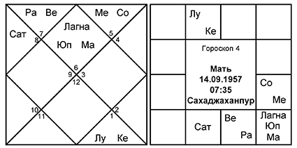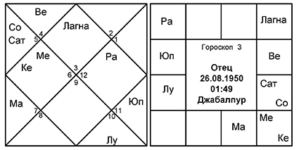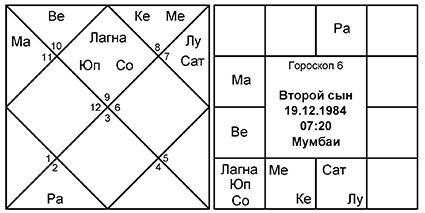 Младшего сына мы будем смотреть по 7-му дому, так как он является 3-м от 5-го. И у матери, и у отца управитель 7-го Юпитер является и управителем Лагны младшего сына и находится в Лагне. Управитель 9-го дома младшего сына, отвечающий за отца, – Солнце. В гороскопе отца Сурья получает аспект Юпитера, управителя 7-го (но не управителя 5-го). Управитель 4-го младшего сына – Юпитер, который является управителем 7-го в гороскопе матери и аспектирует 7-й дом от Лагны. Несомненно, связь очень сильная и устанавливается без особых усилий. Современной медицине потребовалось бы куда больше информации и, вероятно, некоторое время, не говоря об анализе крови всех четырех членов семьи, чтобы прийти к каким-то выводам, в то время как астрологии для этого нужны лишь три базовых параметра: дата рождения, время рождения и место рождения нативов.