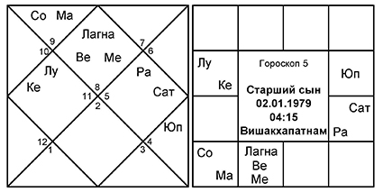 Здесь управитель 5-го дома Меркурий находится в накшатре Раху, который, в свою очередь, вместе с Луной попадает в знак Юпитера. 5-й дом от Меркурия – это Близнецы. Здесь находится Кету, аспектированный Луной, Раху и Марсом. Управитель 5-го вместе с Солнцем и Луной также добавляют свое влияние. Женщина, владелица данного гороскопа, изучала экономику и историю, обучалась музыке и танцу и, наконец, прошла профессиональные курсы управления налогообложением, став инспектором по подоходному налогу.