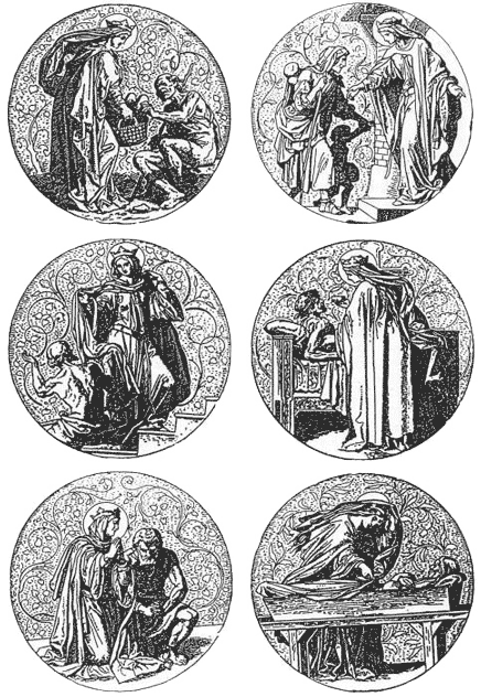 Галерея Елизаветы в Вартбурге. Шесть медальонов Морица фон Швинда показывают Елизавету в ее милосердных деяниях. Названия медальонов слева направо: «Кормление голодного», «Предоставление приюта бездомному», «Одевание обнаженного», «Уход за больным», «Утешение узника», «Погребение умершего»