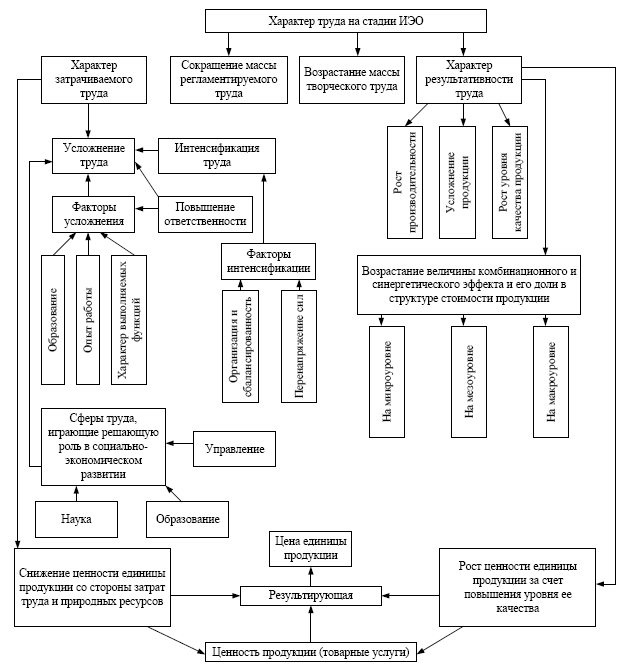 Становление ИЭО коренным образом изменяет характер труда, его затрат и результатов. Данное изменение оказывает самое существенное влияние на механизм формирования ценности продукции. Параллельно возникает необходимость измерения ценности самого труда, в разрезе его отдельных видов, особенно тех, которым принадлежит решающая роль в обеспечении социально-экономического прогресса на стадии ИЭО – труд в науке, образовании, управлении.