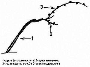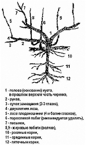 Надземная часть в укрываемой зоне формируется в виде рукавов, отходящих от головы (голова – верхняя часть в прошлом черенка). Рукава – это лозы, старше 2-х лет. От верхних концов рукавов отходят плодовые лозы (стрелки) – это вызревшие однолетние побеги.
