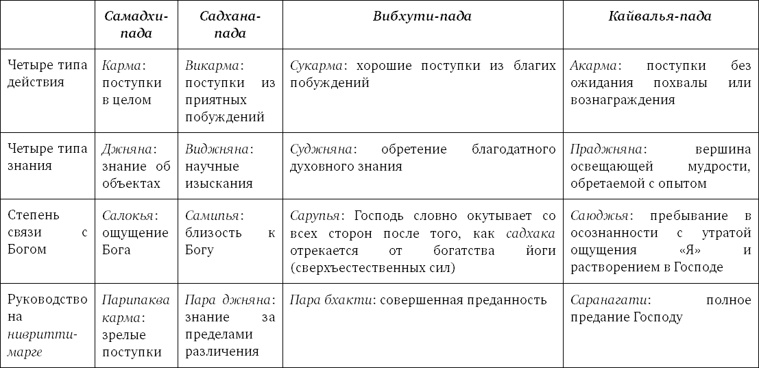 Главы также можно сопоставить с четырьмя специфическими состояниями – салокьей, самипьей, сарупьей и саюджьей. Салокья – это способность познать божественное царство, используя Самадху-паду. Самипья – это приближение к Богу в садхане. Сарупья предполагает восприятие Бога как нечто естественное через богатство (вибхути) йоги и приходит само собой. Саюджья – это пребывание в осознанности, расширение и распространение без ощущения самости, а затем растворение в Боге и слияние с ним. Это окончательное единение Внутренней сущности с божественным – Ишварой.