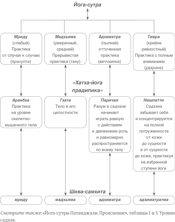 Ту же классификацию практикующих, но в другой терминологии, мы находим в «Хатха-йога прадипике» (IV. 69–76) и Шива-самхите (III. 31–81). Я представил это соответствие наглядно в сравнительной таблице.