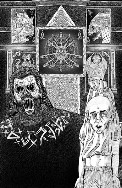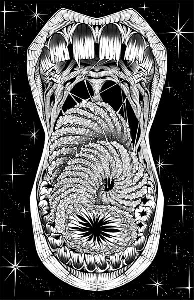 У попа не было глаз. Его лицо представляло собой резиновую маску, подвергшуюся влиянию жара. Резина оплавилась и застыла, облепив череп, повиснув желтоватыми соплями-сосульками. Глазницы спеклись. Тонкие нити соединили губы. Рот попа был распахнут: дыра, ведущая в иные галактики, бурлящий дом безглазых и безгласных богов-людоедов, чертог ползучей заразы.