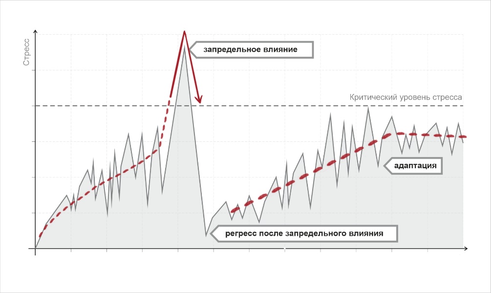 Существуют критические периоды формирования опорно-двигательного аппарата. Они непосредственно связаны с ростовыми скачками и половым созреванием ребенка, и в эти периоды стоит быть особенно осторожным в подборе специальных физических упражнений. Как я уже упоминал ранее, наше тело формируется в результате определенных воздействий, адаптируясь к ним. И результатом адаптации мы видим оптимально сформированные своды стоп. Для более полного понимания я приведу вариант адаптации стопы в виде графика, где по оси абсцисс будет время, а по оси ординат будет уровень стресса. Критический уровень стресса показан горизонтальной линией, разграничивая допустимый уровень воздействия (стресса) на головной мозг ребенка и тот уровень воздействия, который будет восприниматься как экстремальный, то есть вызывать запредельное влияние на нервную систему и опорно-двигательный аппарат ребенка (рис. 1).