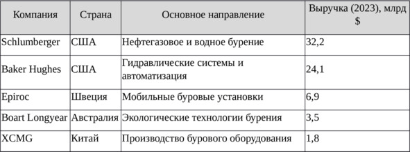 Описание: Таблица содержит список ведущих мировых компаний, работающих в сфере бурения. Лидером является американская Schlumberger с выручкой 32,2 млрд $, за ней следуют Baker Hughes (24,1 млрд $) и шведская Epiroc (6,9 млрд $). Австралийская Boart Longyear специализируется на экологичных технологиях, а китайская XCMG – на производстве бурового оборудования.