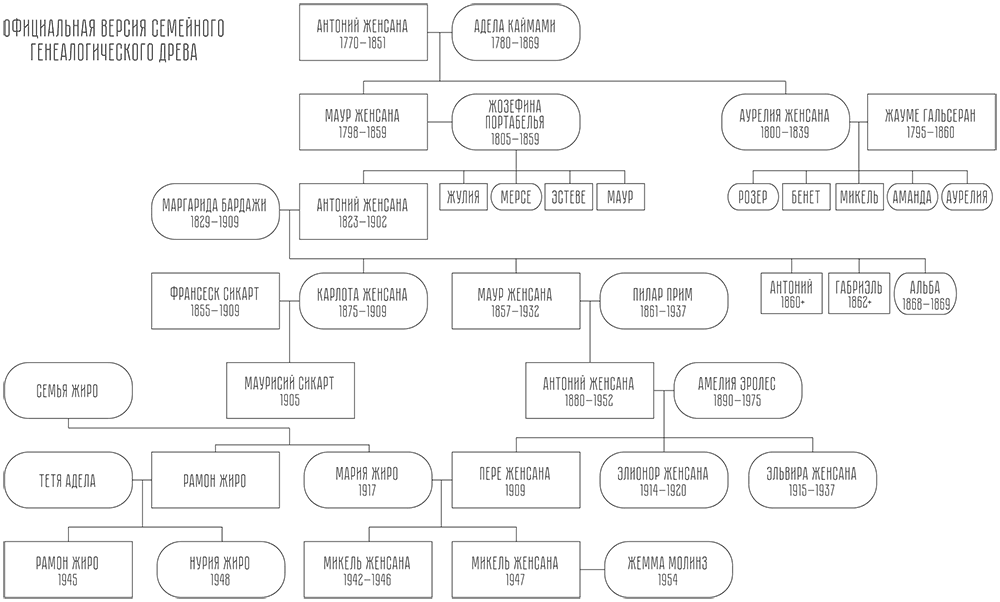Он замолчал. Нервные пальцы забегали в поисках шоколада, но ничего не нашли и затихли, слушая, как дядя говорит: «Знаешь, мама обожала алые розы на розовом кусте у входа в дом. Да, я-то помню, как она их любила, но это воспоминание умрет со мной. Если бы у меня были дети, дети моих детей все равно уже бы об этом не знали. Так, день за днем, те, кого уже нет, умирают все больше и больше, и вскоре остается одно только имя; приходит час, когда ураган забвения сметает их и они исчезают, как унесенное ветром семечко. В чем же тогда ценность современных идей о том, что мы представляем собой цепочку генов, которые воспроизводятся в каждом новом человеке? Хотел бы я с ними познакомиться, пусть они попробуют написать симфонию, эти гены, уже миллионы лет перерождающиеся из поколения в поколение. Твой отец… Хотя нет: твой отец – совсем другая история, потому что он уже сто тысяч лет назад ушел из дома в тапках, в дождь, сказав: я выйду на минуту. А что осталось от твоих дедушки с бабушкой? – (И я ему сказал: „Знаешь, я кое-что помню о бабушке и дедушке с материнской стороны, дядя. У меня остались смутные воспоминания о темной квартире в Барселоне, в Эшампле, о том, как бабушка и дед трепали меня по щеке и угощали карамельками тайком от родителей, а те спешили поскорее уйти. А тети Мерсе и Анна заводили с ними разговор, чтобы еще успеть скормить мне тройную порцию конфет“.) – Хорошо, ну а родители бабушки и деда? Что тебе о них известно? Отрывочные разговоры и ни единой фотографии. Прадеда Жиро́ звали Микель, как и тебя. Но и тебя, и твоего брата назвали Микелями не в честь него, а из-за одной тайной истории любви. Прабабушка Леонор была дочерью солдата-карлиста[12] по имени Жауме Жисперт, который участвовал в восстании Кабреры[13] под командованием Жерони Гальсерана, а потом и в Третьей карлистской войне[14]. Рассказывали, что он был пламенным сторонником наследника престола. И еще добавляли, что в мирное время он был честным позолотчиком статуй и всю жизнь ездил на тарантасе по заброшенным дорогам страны, от церкви к часовне, реставрируя и перекрашивая святых, Христов, Богородиц с алтарей. Говорили, что он был прекрасным реставратором. Но я никогда его не видел, не знаю, на ком он женился, был ли левшой и любил ли рыбу. А по линии твоего отца, в роду Женсана, все гораздо понятнее, потому что у этой семьи замашки старинного рода и страсть хранить и собирать все бумаги, а кроме того, у них есть дядя Маурисий, ставший Официальным Летописцем. Не у всякой семьи есть свой дядя Маурисий. И неясно, хорошо это или плохо. По линии Женсана столько бумаг, что я смогу дойти до Антония Женсаны-и-Пужадеса, праотца династии. Но о его предках уже совсем ничего не известно. И все, что я знаю, и все, о чем я тебе рассказываю, я узнал из документов или услышал в шепоте стен дома, говоривших сами с собой. Или, может быть, я прочитал это в глазах портретов из галереи. А может, мне рассказала это мама Амелия, моя приемная мать, или Синта, одна из тех служанок, что служили в доме, когда я там появился. Кто-то иногда показывал мне портреты в картинной галерее над часовней, которая, казалось, только для того и была построена, чтобы хранить в ней портреты предков. Знаешь, Микель, наша семья всегда стремилась увековечить себя этими портретами.