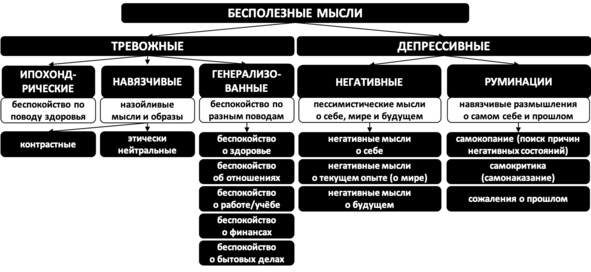 Методологическим фундаментом настоящей работы предстают ключевые постулаты и принципы когнитивной терапии Аарона Бека, рационально-эмоционально-поведенческой терапии Альберта Эллиса, а также краткосрочной стратегической терапии Джорджио Нардонэ, которые являются, образно говоря, тремя китами современной когнитивно-поведенческой психотерапии. На основе концептуального синтеза методов трёх этих психотерапевтических направлений в данной книге раскрываются как специфика, так и способы изменения бесполезных тревожных и депрессивных мыслей и произрастающих из них непродуктивных моделей поведения, которые лишь подпитывают тревожные и депрессивные состояния. К бесполезным тревожным мыслям авторы относят ипохондрические (беспокойство за здоровье), навязчивые (назойливые мысли, образы и сомнения) и генерализованные (беспокойство по разным поводам) мысли, в то время как бесполезными депрессивными мыслями являются негативные мысли (пессимистические мысли о себе, текущем опыте и будущем) и руминации (навязчивые размышления, представленные в виде самокопания, самокритики и сожалений о прошлом) (рис. 1).