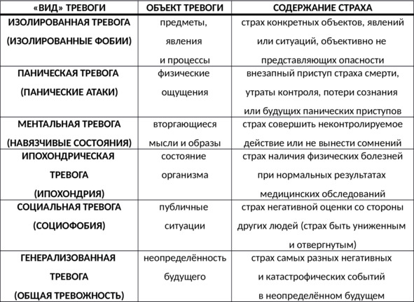 Избыточная тревога может выражаться в разных формах – в виде страхов конкретных предметов и явлений, собственных физических ощущений и симптомов, нежелательных мыслей и побуждений, наличия скрытых соматических или психических заболеваний, критики и осуждения со стороны других людей, а также негативных событий в непредсказуемом и неконтролируемом будущем. Говоря иначе, избыточная тревога может проявляться в форме самых разных тревожных расстройств, в связи с чем тревогу можно очень условно разделить на изолированную (тогда речь идёт о конкретных фобиях), паническую (здесь мы имеем дело с паническими атаками), ментальную (такая тревога имеет место быть при навязчивых состояниях), ипохондрическую (связанную с беспокойством по поводу собственного здоровья), социальную (вызываемую страхом негативной оценки окружающих2), а также генерализованную (беспокойство по разным поводам) (таб. 1).