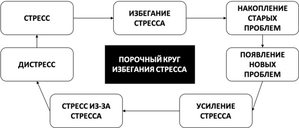 Таким образом, залог благополучия человека состоит не в отсутствии стрессов и не в умении избегать любых переживаний, а в развитии навыков стрессоустойчивости. Действительно, попытки избегания стресса зачастую только усугубляют стресс, поскольку бегство от решения проблем только добавляет напряжения к уже имеющемуся стрессу, ведь накопившиеся проблемы не решаются и множатся, и к тому же появляются новые проблемы. По причине накопления старых и возникновения новых проблем человек испытывает более сильный стресс, мешающий эффективно справляться как с проблемами, так и с самим стрессом. В конечном итоге человек может испытывать стресс из-за самого стресса, что как раз и ведёт к вышеописанному дистрессу (рис. 3). Однако формирование нового, более рационального и реалистичного мышления и устранение неадаптивных моделей поведения способствует не только эффективному решению проблем, развитию стрессоустойчивости и саморазвитию, но и профилактике различных эмоциональных расстройств и дистресса.
