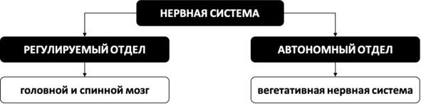 Чтобы человек мог преодолевать различные невротические состояния, эмоциональные расстройства и проявления дистресса, ему важно понимать и физиологические законы их функционирования, и основы устройства нервной системы. Нервная система человека состоит из двух отделов – регулируемого (он включает в себя головной и спинной мозг и позволяет человеку совершать контролируемые действия) и автономного (он самостоятельно регулирует работу внутренних органов и секреций и не зависит от желаний человека) (рис. 4).