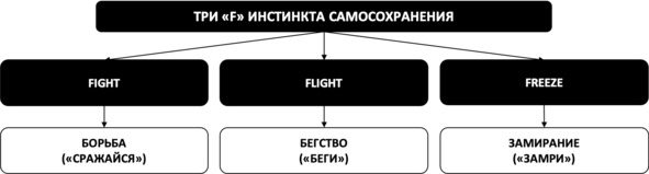 В основе инстинкта самосохранения лежат выработанные эволюцией защитные реакции «беги», «сражайся» и «замри», доставшиеся человеку от древних и диких предков (рис. 6). Эти защитные механизмы срабатывают в ответ на реальную или воображаемую опасность и сопровождается выбросом гормонов стресса (в том числе адреналина), что и приводит организм в состояние повышенной боевой или оборонительной готовности. Иными словами, любая опасная или воспринимающаяся как опасная ситуация приводит в действие симпатический отдел вегетативной нервной системы, который мобилизует организм для бегства или сражения с целью выживания, создавая телесные симптомы – учащённое сердцебиение и дыхание, повышенное давление, мышечное напряжение и др. Но иногда вегетативная нервная система начинает «газовать», когда ситуация тому не располагает, и вместо парасимпатического отдела запускается симпатический (например, человек готовится ко сну, а сердце стучит, давление повышено, мышцы напряжены и т.п.). Говоря иначе, реакция возбуждения не так быстро сменяется реакцией расслабления.