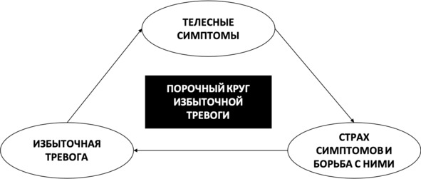В такие моменты человек может начать бояться своих симптомов, тем самым усиливая общий уровень тревоги, которая, в свою очередь, усиливает старые и порождает новые симптомы, что незаметно заводит человека в порочный круг избыточной тревоги (рис. 7).