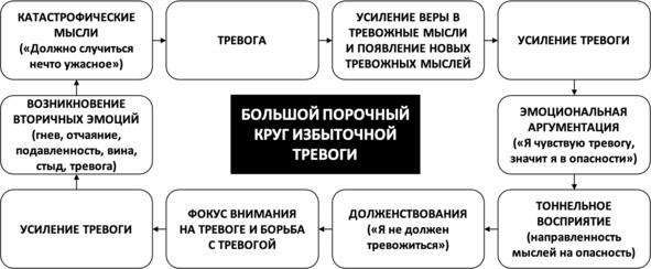 Если рассматривать порочный круг избыточной тревоги более подробно, можно получить следующую порочную цепочку мыслей и эмоций, подпитывающих тревогу. Итак, катастрофические мысли вызывают тревогу, которая, в свою очередь, усиливает веру в катастрофические мысли и производит ещё больше тревожных мыслей, которые приводят к очередному усилению эмоции тревоги. Человек интерпретирует усилившуюся тревогу как свидетельство реальной опасности, иными словами, прибегает к эмоциональной аргументации («Если я испытываю тревогу, значит я действительно в опасности, иначе бы я так не тревожился»). При этом головой он понимает, что, несмотря на кажущуюся реалистичность катастрофических мыслей, они всё-таки иррациональны, но на эмоциональном уровне может верить в их обоснованность из-за эмоциональной аргументации, а также по причине эффекта тоннельного восприятия, о котором мы уже говорили: находясь в тревожном состоянии, человек думает только об угрозах. Более того, человек может требовать от себя отсутствия тревоги («Я не должен тревожиться»), тем самым невольно сосредотачивая своё внимание на тревоге и усиливая её, что ведёт к бессмысленной и беспощадной борьбе с тревогой, а также к возникновению вторичных эмоций по поводу тревоги – гнева, отчаяния, подавленности, вины, стыда и прочих (рис. 8).