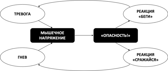 Таким образом, частые, длительные и интенсивные дисфункциональные эмоции (гнев, обида, тревога, стыд, вина, подавленность), порождаемые неадаптивными привычками мышления, не могут не сказываться на физическом самочувствии человека. В частности, наиболее стрессовые эмоции – тревога и гнев – неизменно проявляются в виде мышечного напряжения, которое, в свою очередь, сигнализирует мозгу об опасности и необходимости активации соответствующих защитных реакций («беги» или «сражайся»), обуславливающих усиление, соответственно, тревоги или гнева (рис. 9).