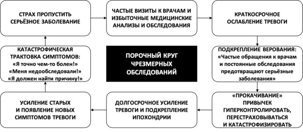 Назойливые визиты к врачам и бесчисленные обследования, порождаемые страхом не успеть вовремя распознать возможную болезнь, временно снижают тревогу, но усиливают её в дальнейшем, потому как подкрепляют ложное верование, что эти действия позволяют предотвращать болезни. В результате привычка перестраховываться, выбирая худшие сценарии, «прокачивается» и ведёт к усилению тревоги и её телесных проявлений, которые, в свою очередь, могут трактоваться как признаки серьёзного заболевания, что запускает новую серию походов по врачам и каскад обследований, что лишь временно снижает тревогу, но подкрепляет привычку беспокоиться.
