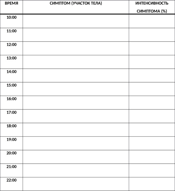 Если вы склонны к частому прислушиванию к своему организму с целью контролирования нежелательных симптомов или поиска признаков заболевания (болей в суставах, шума в ушах, ощущения нехватки воздуха, головокружения и т.д.) и совершаете соответствующие проверочные действия (сгибание конечностей, резкие вдохи, движения головой и пр.), отныне вам придётся строго придерживаться более продуктивного и вместе с тем более парадоксального подхода. Например, если вы испытываете симптомы, локализованные в определённом участке тела и боитесь их появления, то с этого дня вам необходимо будет ежедневно с момента пробуждения и до отхода ко сну каждый час в течение минуты осознанно сканировать этот участок тела на предмет наличия симптома и письменно фиксировать в блокноте степень его интенсивности в процентах (всегда имейте при себе небольшой блокнот). Если же вы испытываете более смутные, размытые и «мигрирующие» ощущения и опасаетесь их возникновения, то вам также необходимо ежедневно каждый час на протяжении минуты намеренно фокусироваться на этих симптомах и пытаться сознательно изменять их (перемещать боль и дискомфорт в разные стороны; повышать и понижать, усиливать и уменьшать писк или шум в ушах или стараться «встроить» эти звуки в мотив или ритм известной песни и т.д.), и записывать в блокнот уровень выраженности этих симптомов. Форма для записей при выполнении этой тактики приведена ниже (таб. 13).