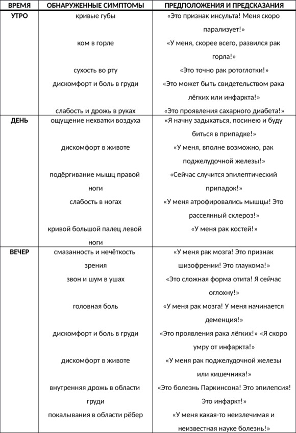 Если вы склонны к частому навязчивому осматриванию, ощупыванию или мысленному сканированию своего тела с целью поиска симптомов или признаков болезни, или если вы по несколько раз перепроверяете свой пульс, артериальное давление, уровень кислорода в крови или температуру тела, отныне вам нужно придерживаться более продуктивной и одновременно более парадоксальной модели поведения. С этого дня вам необходимо ежедневно три раза в день после завтрака, обеда и ужина уединяться в ванной комнате и осознанно и тщательно осматривать и ощупывать себя перед зеркалом спереди и сзади (а также прислушиваться к себе) в течение 13 минут (ни минутой больше, ни минутой меньше), медленно и плавно продвигаясь от головы до ног и обратно, с целью обнаружения нежелательных симптомов и признаков заболеваний. При этом вам нужно подробно записывать в блокноте все обнаруженные симптомы и дискомфортные ощущения и напротив каждого симптома фиксировать любые ваши тревожные предположения и предсказания по поводу каждого ощущения. Таким образом, вам необходимо осмотреть, ощупать и внутренне просканировать каждую часть своего тела с головы до ног и обратно, письменно фиксируя обнаруженные ощущения и их тревожные интерпретации, и выполнять это упражнение три раза в день утром, днём и вечером на протяжении ровно 13 минут на протяжении хотя бы двух недель. Записи по итогам выполнения этой тактики могут выглядеть примерно таким образом (таб. 14):