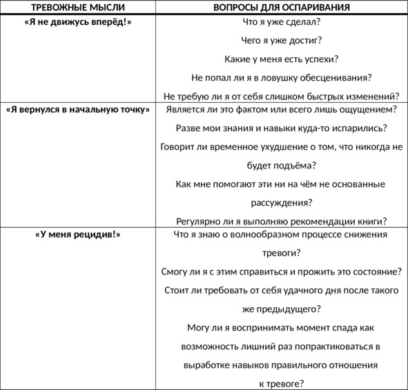 Ваше настойчивое стремление не ощущать избыточной тревоги вполне естественно и понятно, однако, как вы ещё узнаете позже, именно требования отсутствия тревоги и подпитывают её. Вы можете считать, что процесс преодоления тревоги реализуется по медицинской модели: дескать, выпил таблетку от головы – и она больше не болит. Но в случае с избыточной тревогой, являющейся следствием искажённого мышления и неадаптивного поведения, такой подход, увы, не работает. Тем не менее, человек с тревогой склонен часто задавать себе и специалистам вопрос о том, когда уже его «отпустит».