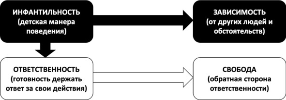В этом отношении Сартр замечал, что успехи и провалы являются результатом свободного выбора самого человека, а поэтому перекладывание ответственности за те или иные события на других или обстоятельства недопустимо. В качестве единственного способа избежать поступков, за которые нужно отвечать, философ утверждал сознательное бегство в эмоции, порождающее реакции, не соответствующие ситуации, – страх, обморок и истерику. Эти эмоции, согласно Сартру, являются игрой, в которую верит человек, а также способом самообмана для избегания ответственности. Из этого следует заключить, что свобода – это обратная сторона ответственности, отсутствие которой порождает зависимость человека от других (см. рис. 7). И действительно, свободу никто не даёт – свободу только берут. Как замечает врач-психотерапевт Дмитрий Викторович Ковпак, если мы не отвечаем за своё поведение, то априори не можем быть свободными, поскольку возникает необходимость зависеть от другого человека, который нужен для того, чтобы решать наши проблемы за нас, как когда-то это делали наши родители, да ещё и нести за это ответственность, которую мы с себя снимаем. Поэтому обращение людей к психотерапевту зачастую выглядит как попытка сделать последнего ответственным за то, что будет происходить в их жизни. Но только вам решать, есть ли смысл держаться за прежние модели мышления и поведения, или полезнее начать постепенно меняться, принимая ответственность за свою жизнь. Если эти слова не показались вам убедительными, задайтесь вопросом: «Кто является источником моей тревоги и симптомов? Правительство, магнитные бури, дурная наследственность или всё-таки я сам?»