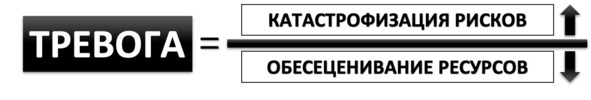 Таким образом, во время эпизодов тревоги человек избыточно концентрируется на мыслях об опасности и своей неспособности справиться с тревожащей ситуацией, что приводит к невозможности более трезвого рассмотрения менее угрожающих вариантов развития событий, поскольку в моменты выраженной тревоги довольно сложно мыслить рационально. Иными словами, человек начинает тревожиться, когда риски трактуются как высокие, а он не осознаёт, за счёт чего и как можно с ними совладать (см. рис. 9).