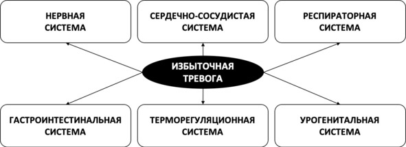 Важно понимать, что симптомы, вызванные избыточной тревогой, какими бы неприятными они не были, являются не признаком реального органического заболевания, а следствием искажённого мышления, которое создаёт тревогу, не могущую проявляться иначе как в виде телесных симптомов. А симптоматики, порождаемой избыточным уровнем тревоги, может быть превеликое множество, ведь тревога заставляет активно работать разные органы и системы человеческого организма (см. рис. 12).