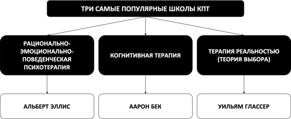 Однако самыми популярными и фундаментальными школами в рамках когнитивно-поведенческого подхода являются рационально-эмоционально-поведенческая психотерапия А. Эллиса, когнитивная терапия А. Бека и терапия реальностью (теория выбора) У. Глассера (рис. 3).