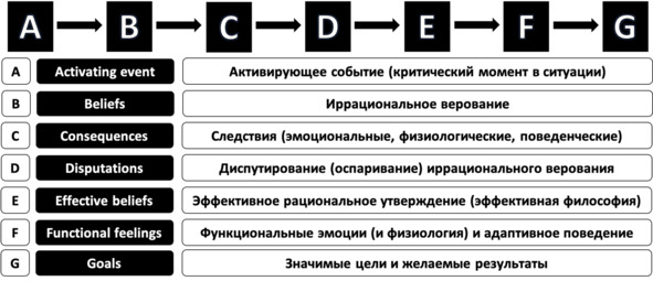 Основоположник рационально-эмоционально-поведенческой терапии (РЭПТ) А. Эллис подчёркивал, что формула А-В-С (activating event – beliefs – consequences), объясняющая способ восприятия человеком действительности и проясняющая источник его эмоционального стресса, проста для понимания, как азбука, и в этой связи доступна для освоения каждому человеку. Продолжение этой буквенной формулы отображает не менее понятные шаги для преодоления дисфункциональных реакций и улучшения качества жизни: D (disputations) – диспутирование иррациональных верований (создающих дисфункциональные эмоциональные, телесные и поведенческие реакции); E (effective beliefs) – эффективные рациональные утверждения (формулирующиеся в результате оспаривания иррациональных верований); F (functional feelings) – функциональные эмоциональные, телесные и поведенческие реакции (являющиеся следствием эффективных рациональных утверждений); G (goals) – значимые для человека цели и желаемые результаты (достигающиеся на основе рациональных утверждений и функциональных реакций)6. При этом формула А-В-С является диагностической, поскольку отражает механизм формирования дисфункциональных реакций, в то время как её продолжение (D-E-F-G) представляет собой терапевтические шаги для снижения избыточных реакций и достижения значимых целей (как внутри конкретного активирующего события (краткосрочные), так и в жизни в целом (долгосрочные)) (рис. 7).