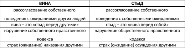 Эмоции стыда и вины очень схожи, и порой их довольно сложно отличить друг от друга, тем более что они часто возникают одновременно. К тому же вина на самом деле не является какой-то отдельной эмоцией, а представляет собой «контейнер», который в том числе нередко содержит в себе стыд. Действительно, и вина, и стыд возникают по причине требований человека к своему поведению, иными словами, из-за мыслей о том, что человек не должен был поступать так, как поступил, и сопровождаются страхом наказания и осуждения со стороны других. Обе этих эмоции также имеют общую тему в виде воображаемого или действительного нарушения человеком общепринятых нравственных норм. Однако если в случае с виной человек расстраивается из-за того, что нарушил требования, предъявляемые к нему другим человеком, с которыми он внутренне соглашается, то при стыде большее значение имеет отклонение от собственных требований человека к самому себе, которые, как ему кажется, разделяют все остальные люди. Если человек говорит о том, что ему стыдно перед кем-либо, это означает, что к стыду примешивается вина, усиливающая стыд. Условные критерии разграничения вины и стыда представлены в нижеследующей таблице (таб. 10).