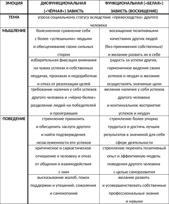 Таб. 12. Сравнительная характеристика дисфункциональной и функциональной зависти