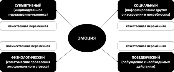 Таким образом, ошибочные представления о реальности способствуют возникновению избыточных негативных эмоций, которые, в отличие от породивших их искажённых мыслей, бессмысленно оспаривать, поскольку любые эмоции сообщают об имеющейся у человека проблеме, требующей внимания и решения, а также несут в себе физиологический, поведенческий, субъективный и социальный смыслы (рис. 26).