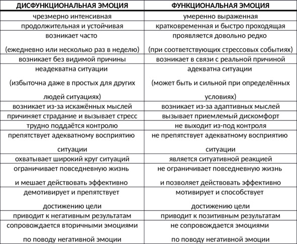 Если выше были детально представлены качественные критерии отличия конкретных избыточных негативных эмоций от их здоровых аналогов, то в нижеприведённой таблице подробно рассматриваются более общие (в том числе количественные) критерии размежевания дисфункциональных и функциональных эмоций как таковых (таб. 14).