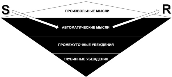 Произвольные мысли – поверхностные и осознаваемые мысли, которыми человек может распоряжаться и управлять и которые возникают вследствие рассуждений. Осознанное восприятие человека ограничено, в среднем, 7±2 произвольными мыслями: в один момент времени человек не может удерживать в сознании более девяти объектов. Однако мыслей, которые находятся за пределами сознательного восприятия человека и автоматически проносятся в голове в фоновом режиме, гораздо больше. Мысли, которые не находятся в фокусе осознанного внимания человека, становятся автоматическими и опускается на более глубокий и менее осознаваемый уровень. В отличие от произвольных, автоматические мысли – спонтанно и молниеносно возникающие в конкретных ситуациях отрывочные и обрывочные слова, образы, картинки, представления, воспоминания или фантазии, которые человек может практически не осознавать, но которые могут приводить к избыточным стрессовым эмоциям, телесным симптомам и проблемному поведению. Даже если человеку удаётся вывести автоматические мысли на сознательный уровень, они всё равно кажутся ему убедительными, достоверными и правдоподобными, что часто создаёт у человека иллюзию того, что их невозможно изменить или оспорить. Итак, автоматические мысли представляют собой, согласно определению А. Бека, «поток мышления, который существует параллельно с более явным потоком мыслей». Среди прочих характеристик автоматических мыслей также стоит отметить рефлекторность, свёрнутость, неконтролируемость, быстротечность и стереотипность. Также важно помнить о том, что фундаментом автоматических мыслей являются промежуточные и глубинные убеждения (рис. 27), речь о которых уже шла ранее и которые будут подробнейшим образом рассмотрены в следующих частях книги11.