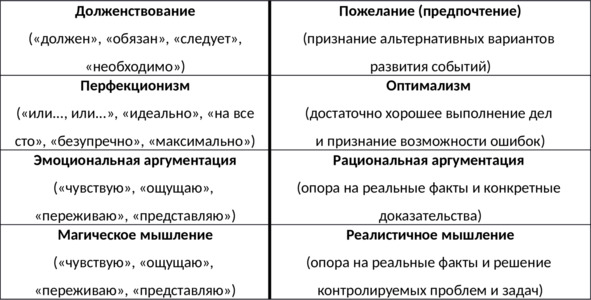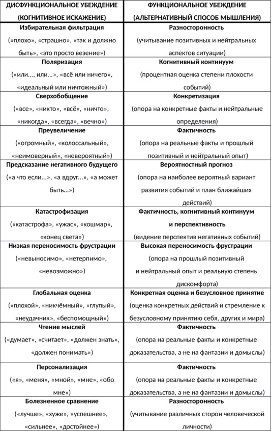 Чтобы обобщить многообразие рассмотренных когнитивных искажений (дисфункциональных убеждений), а также схематично описать альтернативные способы мышления для каждой иррациональной установки, ниже приводится соответствующая таблица (таб. 24).
