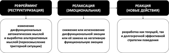Таким образом, структуру желаемых клиентами изменений при работе с дисфункциональными автоматическими мыслями можно представить в виде следующей наглядной схемы, включающей в себя три ключевых компонента (три «Р») – рефрейминг (когнитивную реструктуризацию), эмоциональную релаксацию (ослабление дисфункциональных эмоций) и реакцию (совершение более адаптивных действий) (рис. 29):