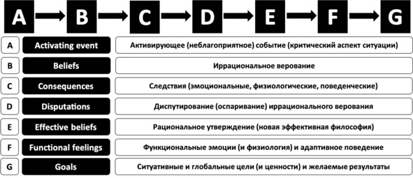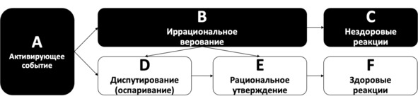 В свою очередь, к здоровым (адаптивным, конструктивным) поведенческим реакциям (С=F) можно отнести, например, решение проблем, активный образ жизни, открытое высказывание эмоций и желаний, разумное стремление к удовольствиям, уверенное поведение, поддержку себя и других и т.д., в то время как нездоровыми (неадаптивными, проблемными) моделями поведения являются такие, как гиперконтроль, перфекционизм, конформность, агрессия, зависимость от алкоголя, компульсивное переедание, прокрастинация, пассивность, поиск заверений, избегание общения, сложных задач и т. п. Как пишет А. Эллис, «если вы чувствуете себя несчастным или действуете нелепо (пункт С…), то ваша цель в пункте А блокируется» (Эллис, 2021). Однако часто человек самостоятельно создаёт эмоциональные и поведенческие барьеры (С) на пути реализации своих целей и ценностей (G), придерживаясь иррациональных верований (В) в отношении нежелательных активирующих событий (А). Таким образом, нездоровые эмоции и поведение именуются нездоровыми хотя бы потому, что они препятствуют реализации значимых для человека целей и ценностей.