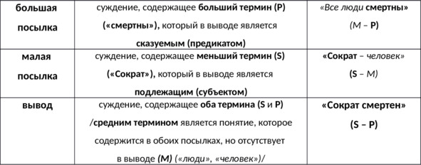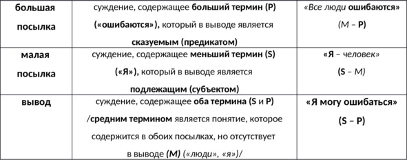 При осуществлении логического диспута нередко используется категорический силлогизм Аристотеля. Силлогизм – способ логического дедуктивного умозаключения, в рамках которого из двух исходных истинных суждений (посылок) с необходимостью выводится третье истинное суждение (вывод). Итак, категорический силлогизм включает в себя большую посылку («Все люди смертны») и малую посылку («Сократ – человек»), из которых с неизбежностью следует вывод: «Сократ смертен». Таким образом, структура категорического силлогизма такова (таб. 14):