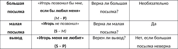 Люди редко задумываются о посылках своего мышления и фокусируются, в основном, на искажённом выводе, который и приводит к избыточным эмоциональным (и проблемным поведенческим) реакциям. Ниже приводится пример такого искажённого вывода, проистекающего из ошибочной большой посылки (таб. 16).