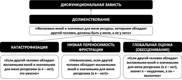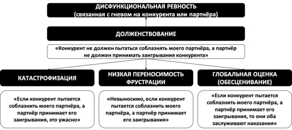 С точки зрения РЭПТ источником любой нездоровой негативной эмоции является долженствование, а также одно или несколько производных от него убеждений – катастрофизация, низкая переносимость фрустрации и/или глобальная оценка (себя, других или мира). Ниже представлены РЭПТ-формулы ревности, связанной со страхом потери значимых отношений (рис. 33) и с гневом на конкурента или партнёра (рис. 34).