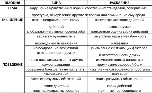 Таб. 9. Сравнительная характеристика вины и раскаяния