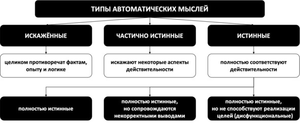 Важно понимать, что автоматические мысли – это не реальность, а всего лишь её интерпретация, которая далеко не всегда соотносится с фактами и логикой. Появление какой-либо негативной автоматической мысли не предполагает того, что она корректно описывает реальность, а поэтому её истинность можно и нужно проверять. Тем не менее, можно выделить три типа автоматических мыслей – искажённые, частично истинные и истинные. Искажённые мысли – это мысли, возникающие в голове вопреки фактическим или логическим доказательствам их ошибочности. Частично истинные мысли —мысли, которые адекватно описывают реальность, однако искажают некоторые или многие её аспекты. Наконец, истинные мысли – это мысли, которые соответствуют действительности. Несмотря на то что автоматические мысли могут адекватно отображать реальность, они могут сопровождаться некорректными выводами или являться дисфункциональными (см. рис. 24).
