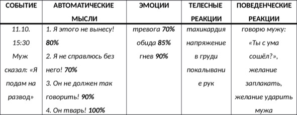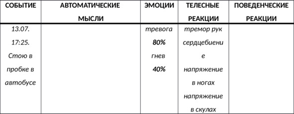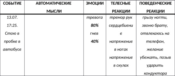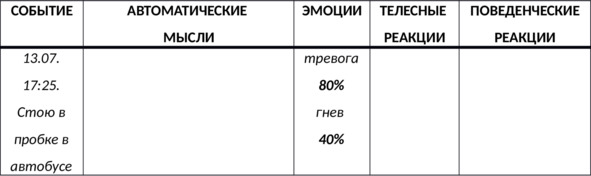 Эмоция – это то, что можно назвать одним словом: тревога, обида, гнев, вина, стыд, подавленность, зависть, ревность. Если для описания эмоции вам требуется несколько слов, значит вы описываете мысль, которую следует записать в соответствующую колонку. N.B.