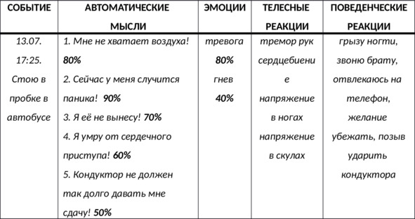 Не описывайте эмоции в колонке для автоматических мыслей: помните, что фраза «Я почувствовал тревогу» описывает эмоцию, которую стоит одним словом описать в колонке для фиксирования эмоций. N.B.