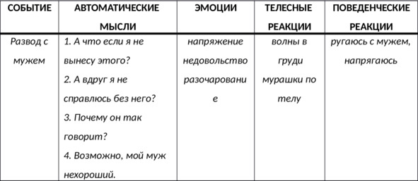 Важновыявлять первую автоматическую мысль, которая пронеслась в вашей голове за считанные доли секунды до возникновения той или иной эмоции: как правило, первые мысли – это оценка ситуации, которую вы можете раскрыть, задав себе вопрос: «Что для меня значит эта ситуация?» N.B.