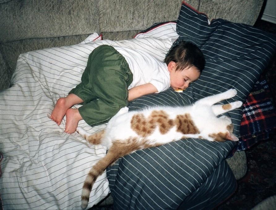 В нашем доме всегда жили кошки. Домашний уют просто немыслим без бригады кошек, постоянно тусующихся под ногами. Когда родился Робин, у нас их было три: рулевая кошка Гизмо и две робкие белые сестрички, Дэйзи и Поппи, тёзки дочерей шеф-повара Джейми Оливера. Робин рос в окружении кошек. И думаю, что когда пришло время учиться ползать, то именно глядя на кошек, Робин начал делать это на всех четырёх. Он копировал их способ перемещения и гонялся за ними, развивая немалую скорость, чем разрабатывал свою центральную нервную систему и позвоночник. То, что доктор Натан прописал. Любимой кошкой Робина в то время была Поппи, потому что она была единственной из троицы, кто позволял неуёмному карапузу гладить себя и тыкать пальцем в нос.