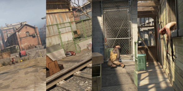 Внимание к ключевым проходам и местам, с которых открывается вид на важные скриптовые сцены, привлекают при помощи обезображенных мутацией тел.
