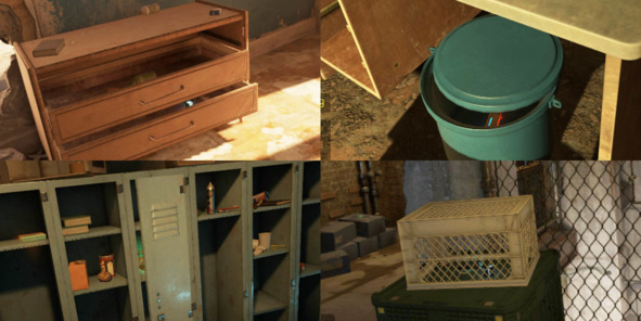 Дизайнеры специально оставляют полуоткрытыми ящики, шкафчики, ведра, а также накрывают коробками с полупрозрачной сеткой, чтобы игроку не нужно обшаривать каждый выдвижной ящик или шкафчик – всё всегда лежит на виду.
