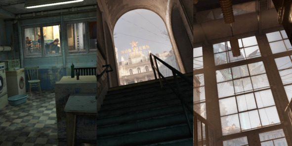 Например, самая первая скриптовая сцена с дружественным персонажем находится на выходе из лифта за окном (рис. 1). Вид на здание отеля «Северная звезда» обрамляют при помощи арки на выходе из метро (рис. 2). Летающую тюрьму-хранилище мы впервые видим, находясь в узком коридоре, которое упирается в панорамное окно (рис. 3).